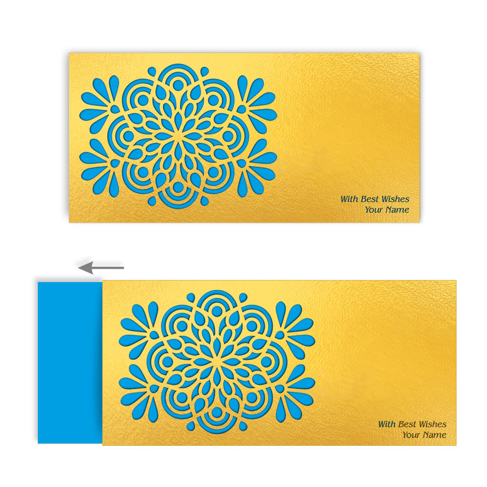- Customized / Non Customized Exlusive Shagun envelope made of Velvet Finish card with Mettalic Finish laser-cut Sleeve. Personalized with your message / Name.