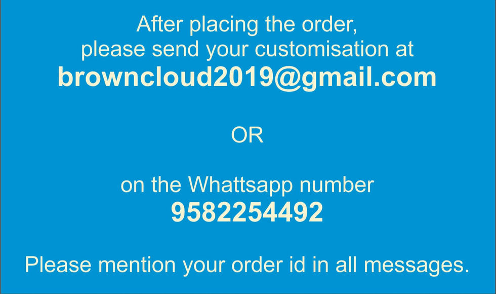 - After placing the order, send your customization and style preference along with order id to browncloud2019@gmail.com